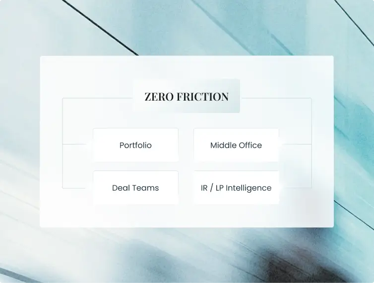 Transform how PE works with purpose-built private equity solutions. Deal teams accelerate from teaser to IC in days, portfolios surface value creation in real time, IR delivers always-current LP intelligence, and middle office connects everything seamlessly on one platform with zero friction.
